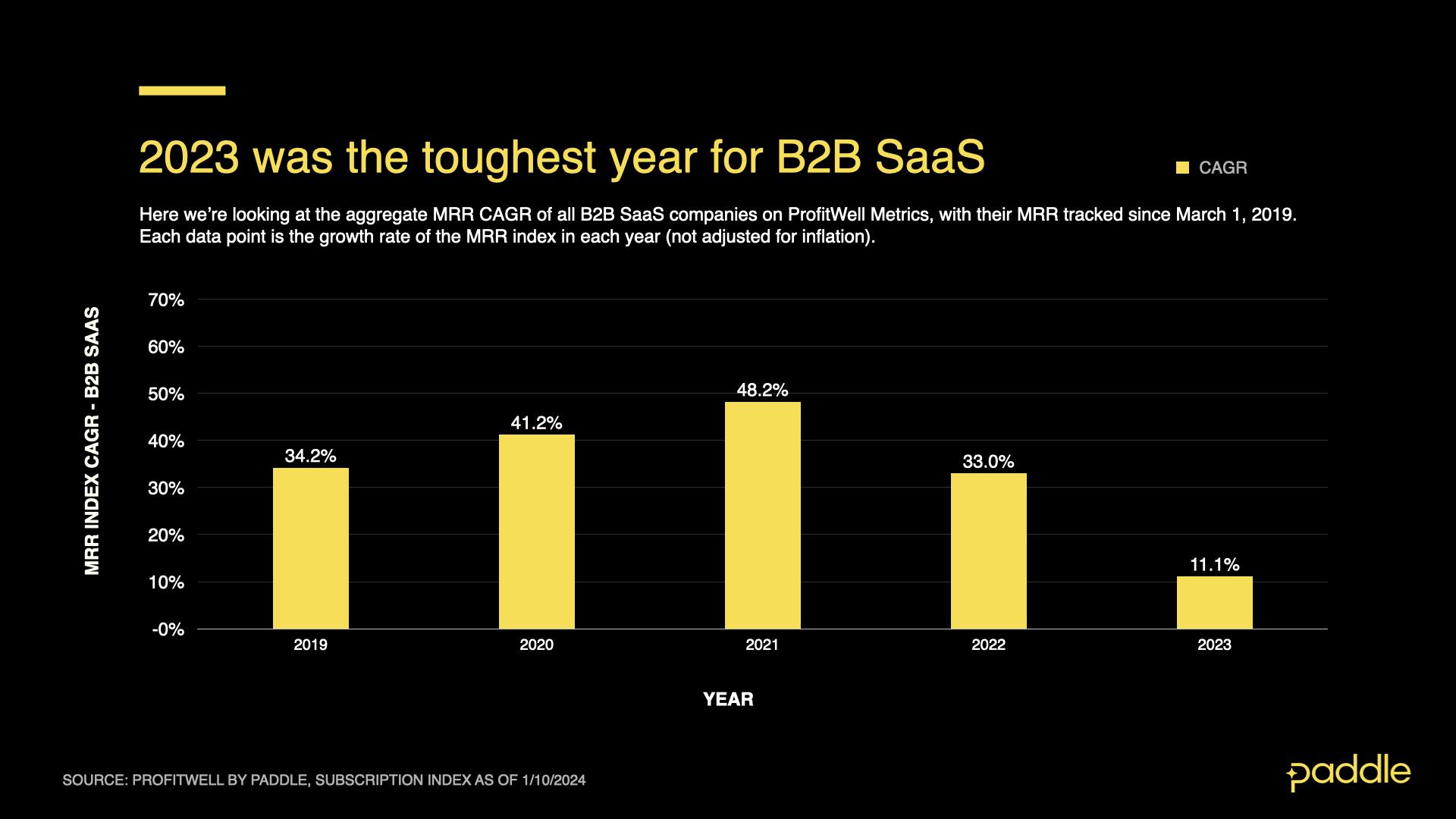 December 2023 marked the first-ever revenue decline in the ProfitWell B2B SaaS Index following a steady drop in revenue growth and caps off the worst year for B2B SaaS.