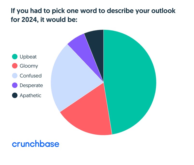 In a Crunchbase survey, 47% of respondents said they felt “Upbeat” to describe their outlook for 2024, with “Confused”, and “Gloomy” coming in at second and third place.
