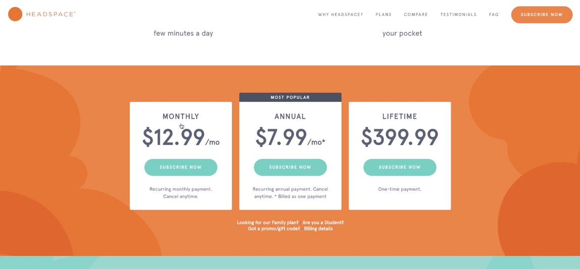 This is where you see the premium coming in. With their Lifetime package coming in around 30% higher than Calm and their annual boosted almost 50%, Headspace is positioned a bit higher overall. They also feature a monthly package, which is a bit more enticing for some customers.