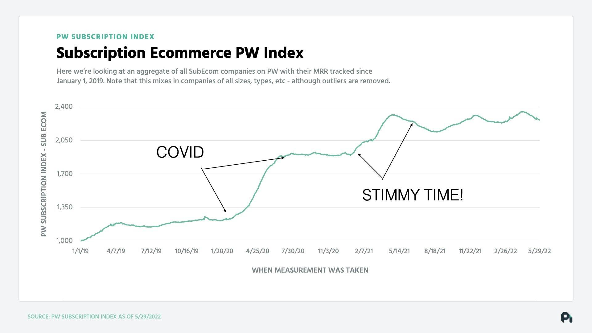 Subscription ecommerce accelerated ten years through COVID and then helped along by stimulus payments (or stimmies) made by the US government during the pandemic. Just take a look: