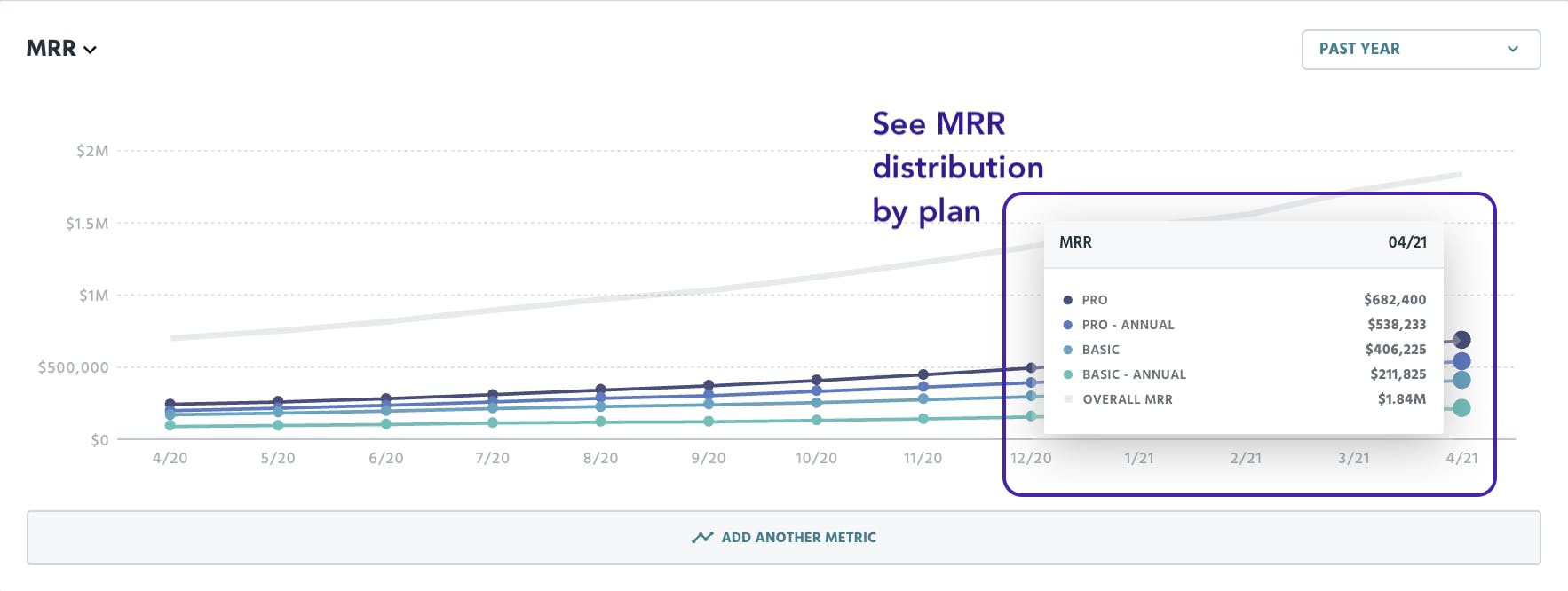 With ProfitWell Metrics, you can clearly attribute MRR by a monthly subscription plan and analyze growth on a plan-by-plan basis: