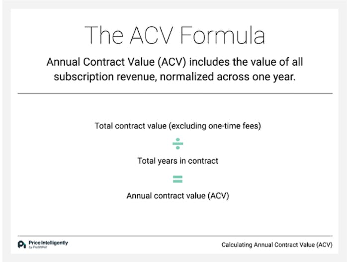 The basic formula for ACV is fairly simple. It’s the total contract value (excluding one-time fees) divided by the total years in the contract).