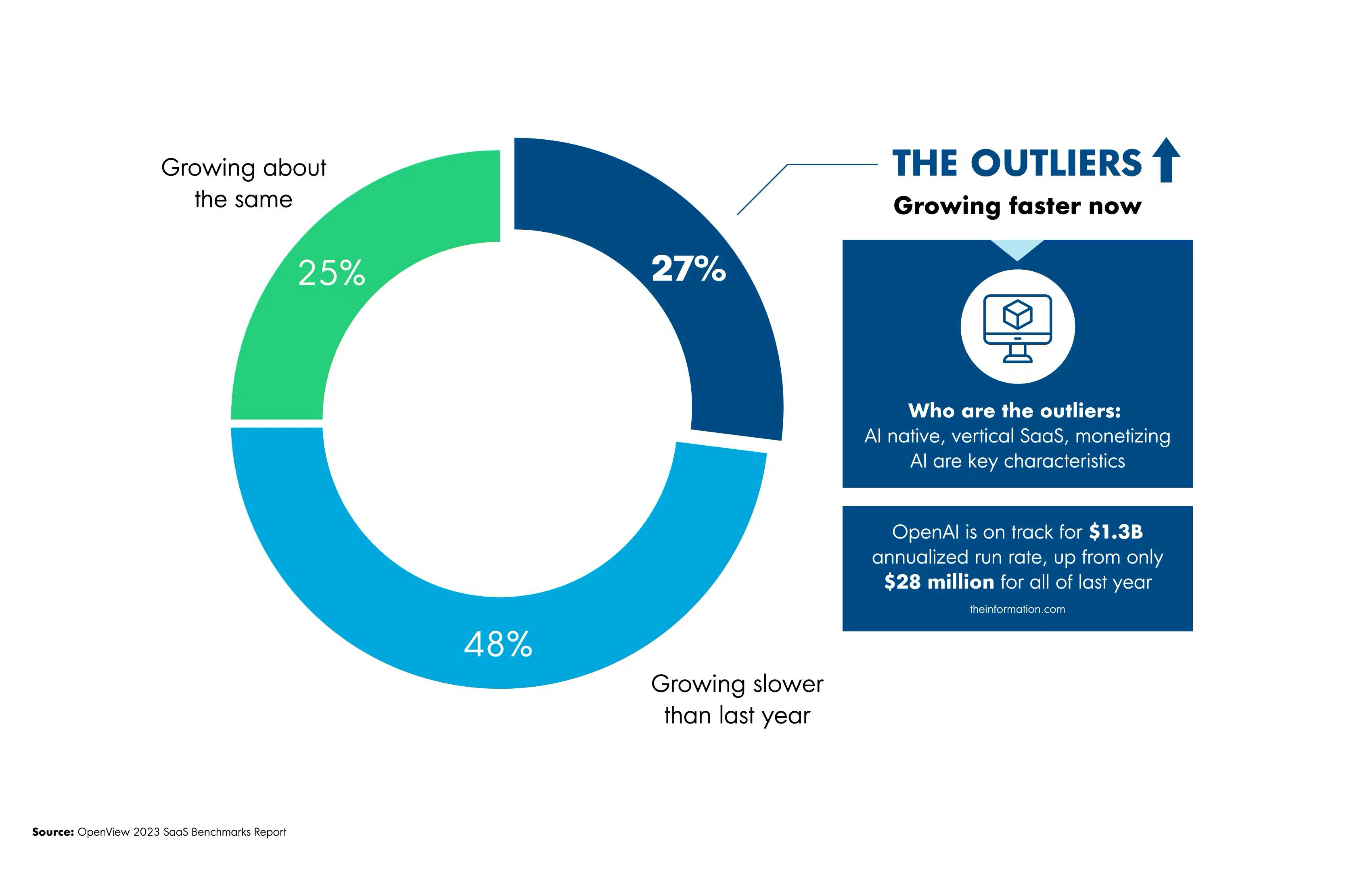 Roughly one-quarter of companies actually reported growing faster in 2023 compared to 2022 and we deemed these the “Outliers” bucking the downward trend. They were made up of three key groups: AI-native companies, vertical SaaS, and those companies successfully monetizing AI.
