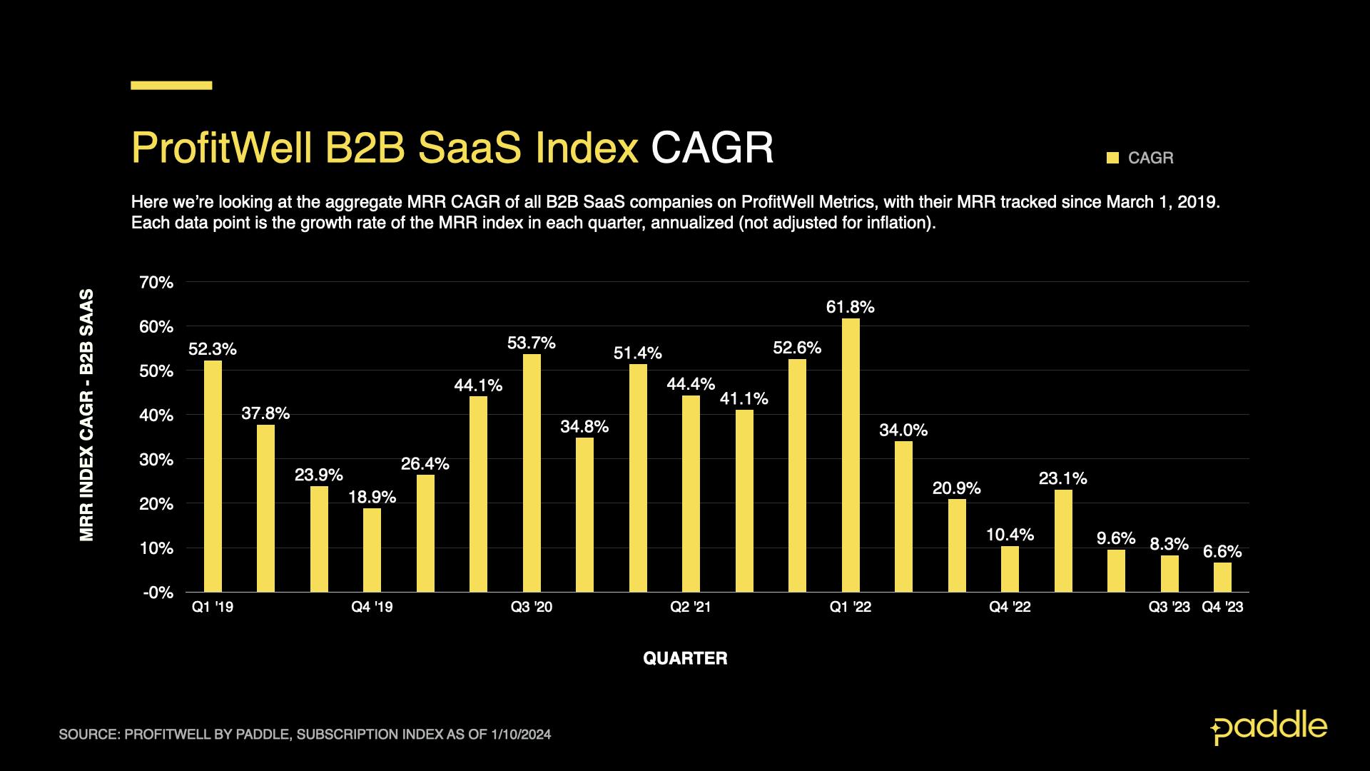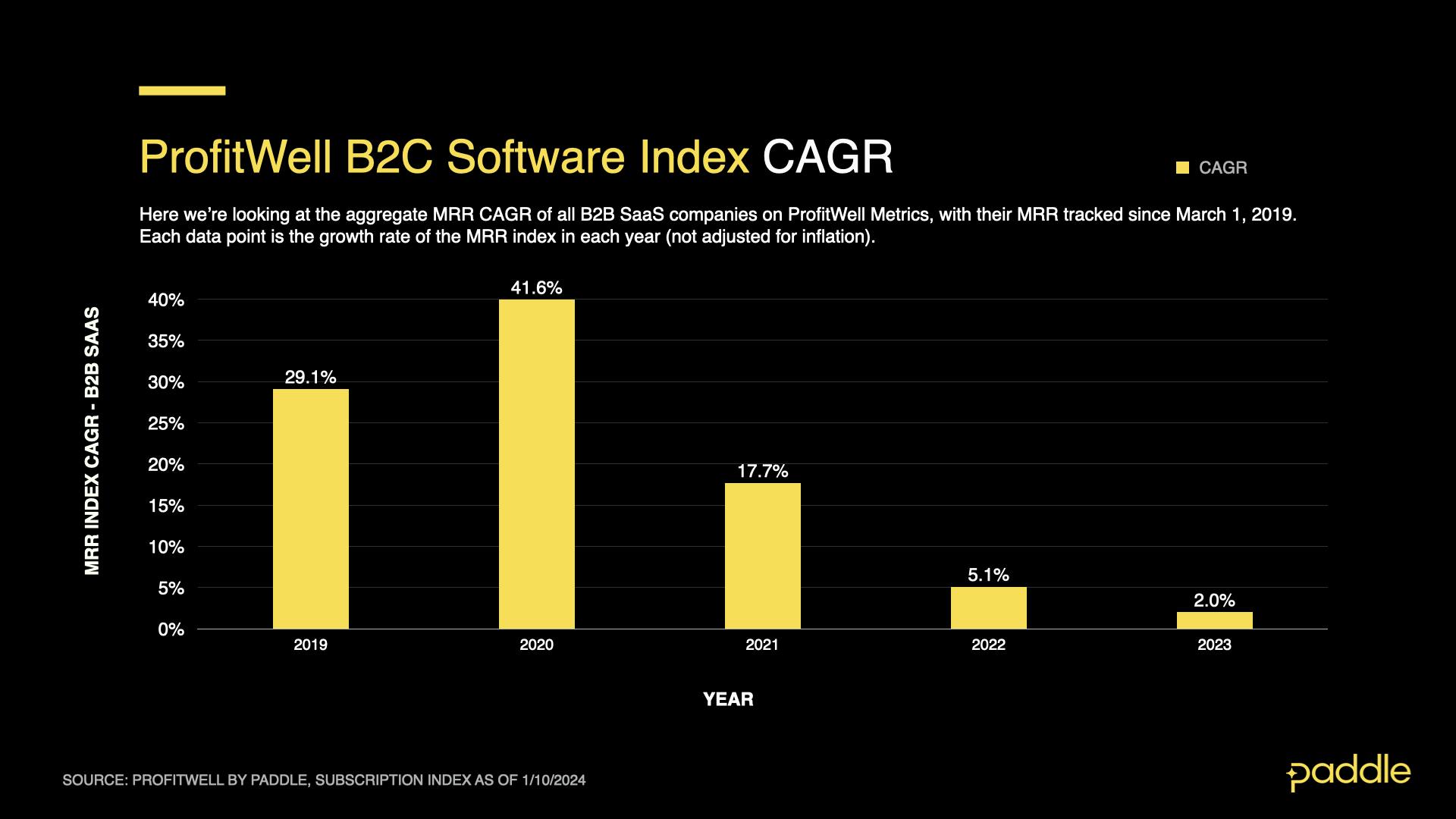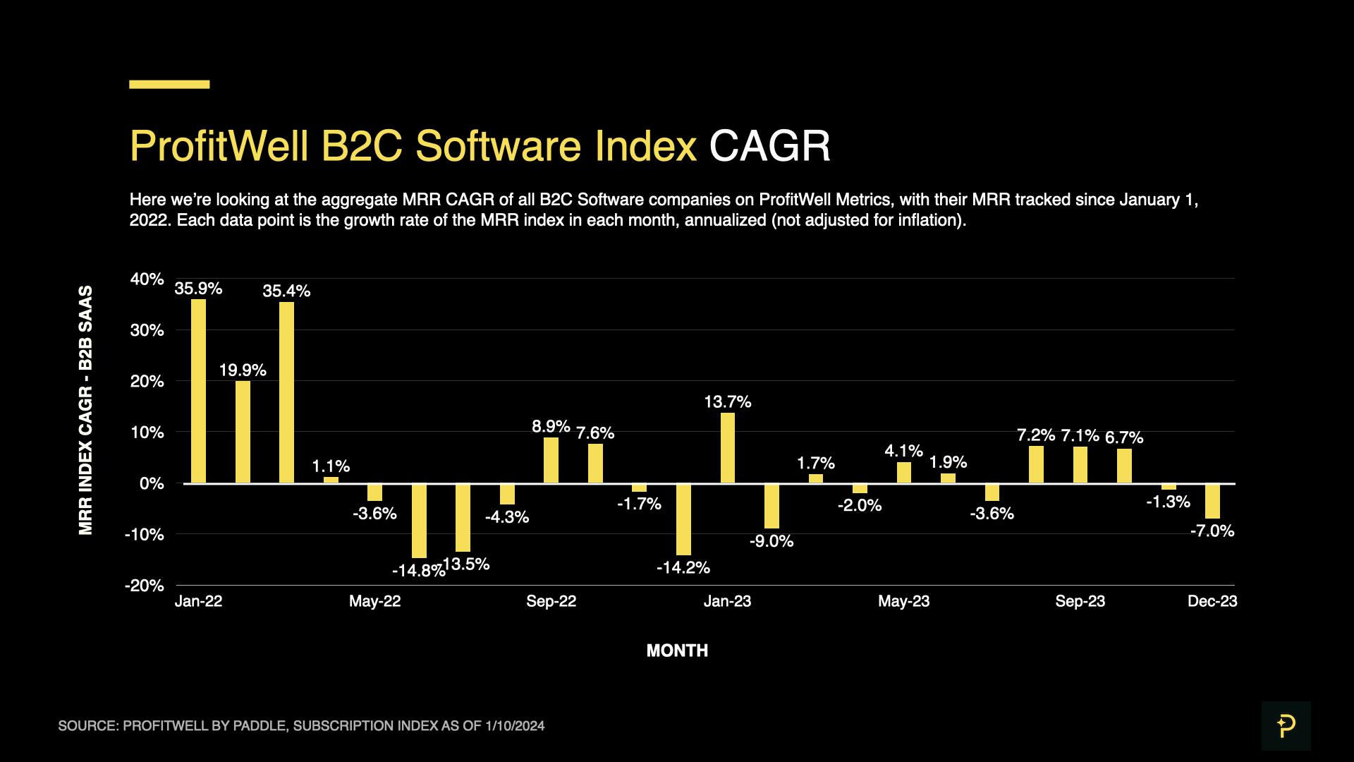 The ProfitWell B2B SaaS Software Index experienced its first decline in compound annual growth rate (CAGR) since we started tracking the index in January 2019. December 2023 ended at -4.0%, down 10.5% from November 2023 and ending the year at a record low.