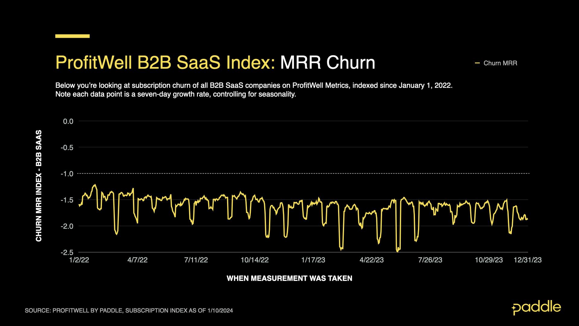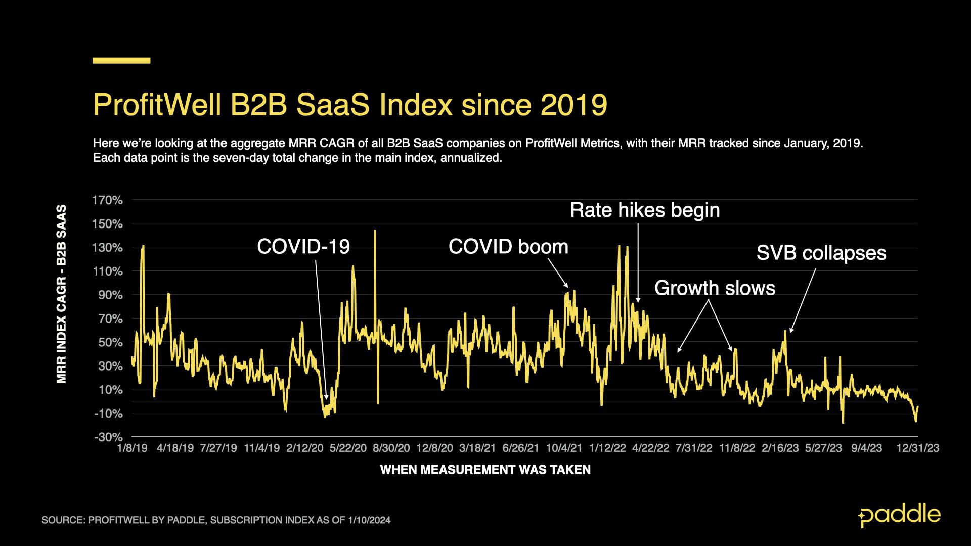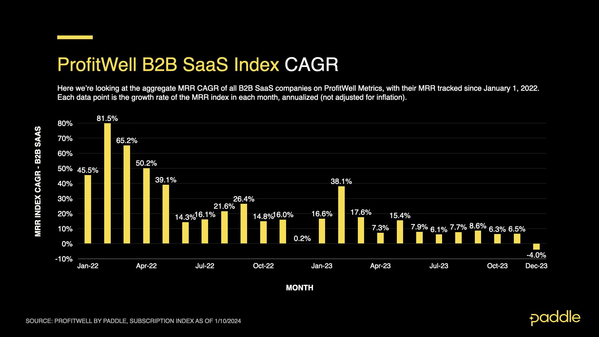 December 2023 marked the first-ever revenue decline in the ProfitWell B2B SaaS Index following a steady drop in revenue growth and caps off the worst year for B2B SaaS.