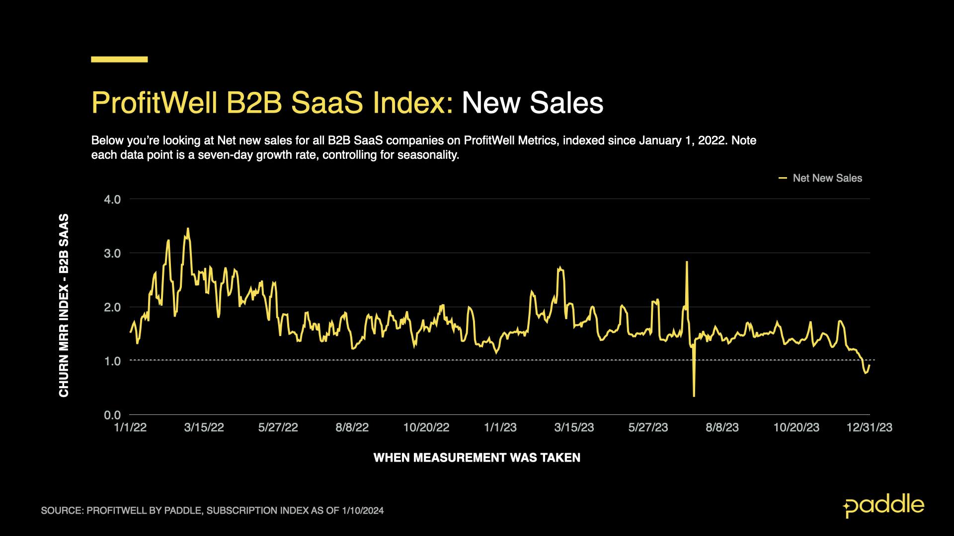 The ProfitWell B2B SaaS Sales Index slumped to an average of 1.22 making it the lowest sales month since December 2020. It was also down 14% from November 2023 and down 15% from December 2022.