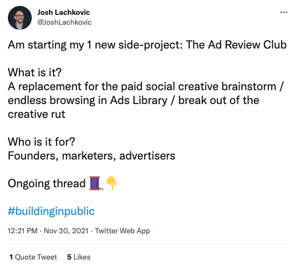 We love this example, where @JoshLachkovic touches on marketing his product, saving others time by having all ideas for paid ads in one place.