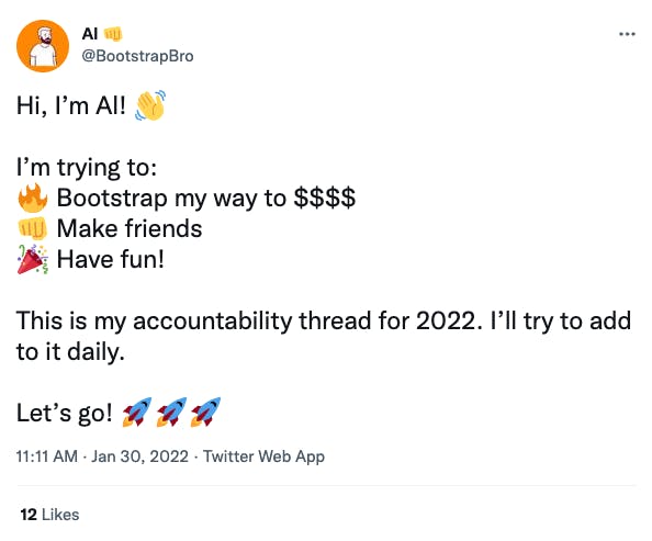 This real-time thread is all about accountability, and it’s being updated on a daily basis for some real insight into the life of @BootstrapBro. (He’s actually doing very well with that promise).