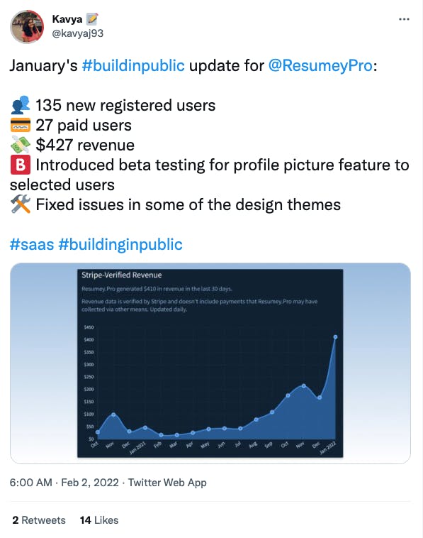 Take a look at this one, where @kavyaj93 includes numbers, graphs, and feedback from users in January 2022. We’ll be back to see what February brought for Resumey.Pro, won’t we?