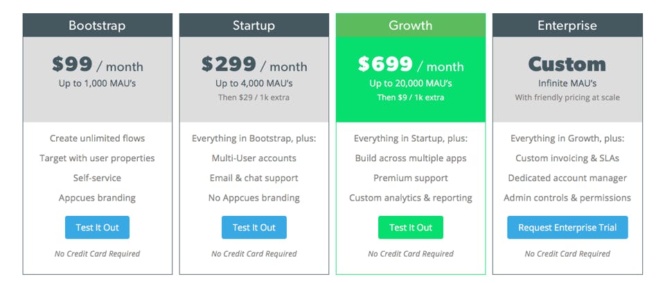 For example, a customer in the Bootstrap buyer persona might be a small startup. They have a small team and they're trying to get their app up and running. The user onboarding services that Appcues provides is important in these early stages, but the app doesn't have many users yet so they don't need to pay for a lot of MAUs. A low price point is attractive to this small company that doesn't have much capital.