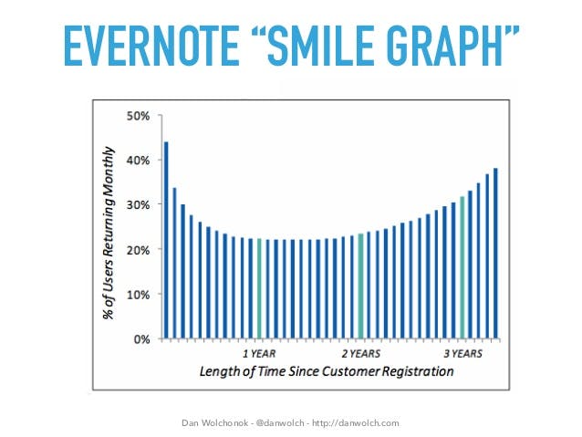 Evernote is an excellent example of how long-term churn should be handled. Because they make an effort to get their core value in front of their customers over and over again, their retention curve looks like a smile.