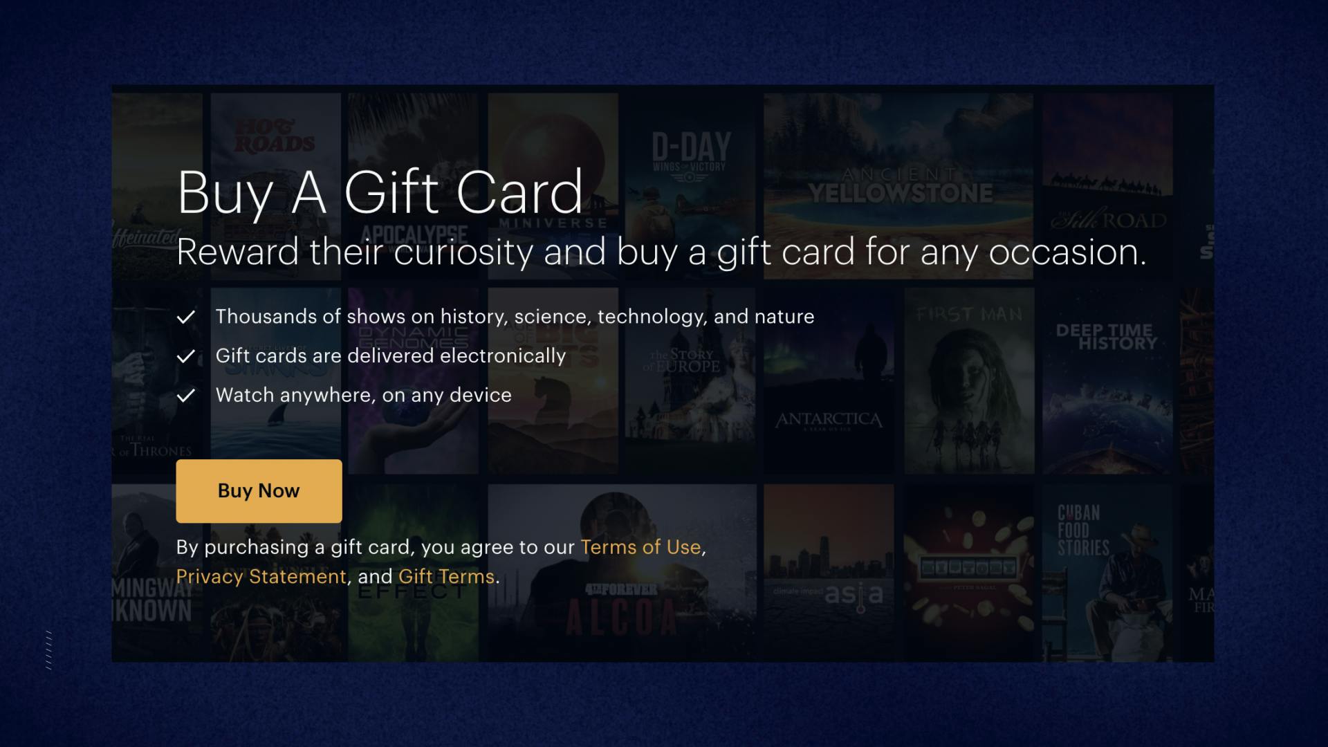 The other thing around the gift card or like the gifting, which I want them to kind of re rename this as I love this reward, the curiosity. But this is something really smart about a product like this because if you like it, you probably want a gift it to someone else because you're already talking about it. You're like, Oh, I got to get you on Curiositystream or Oh, we got to get the kids on Curiositystream.