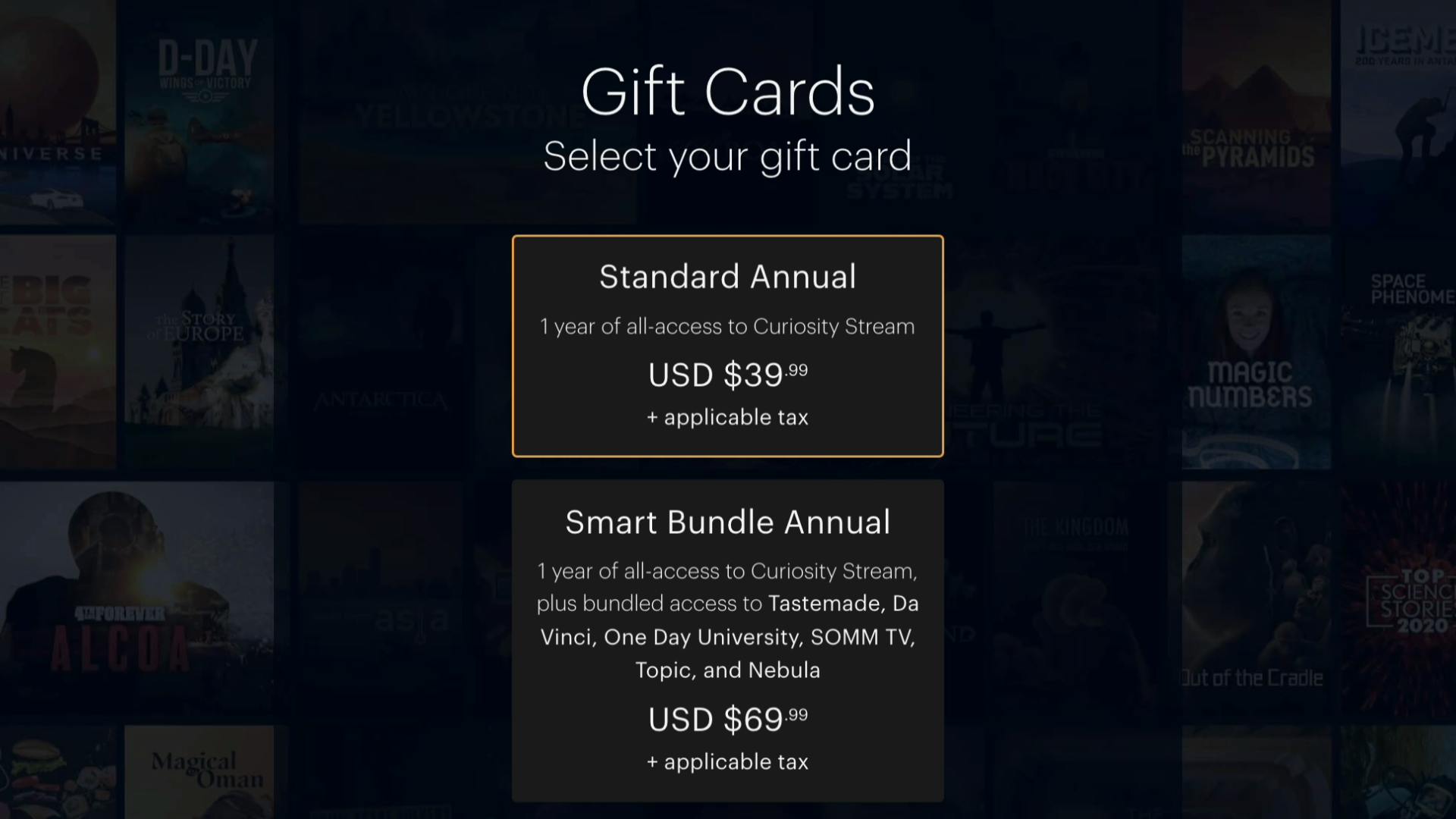 One thing that kind of annoys me when it comes to their pricing because it's so good, but they're not advertising it the way that they should, is under the gift plan. If you go into buy now, you can give the standard the smart bundle and then there's the standard lifetime license. So this is basically you pay one fee, $250, and then you get access to curiositystream forever.