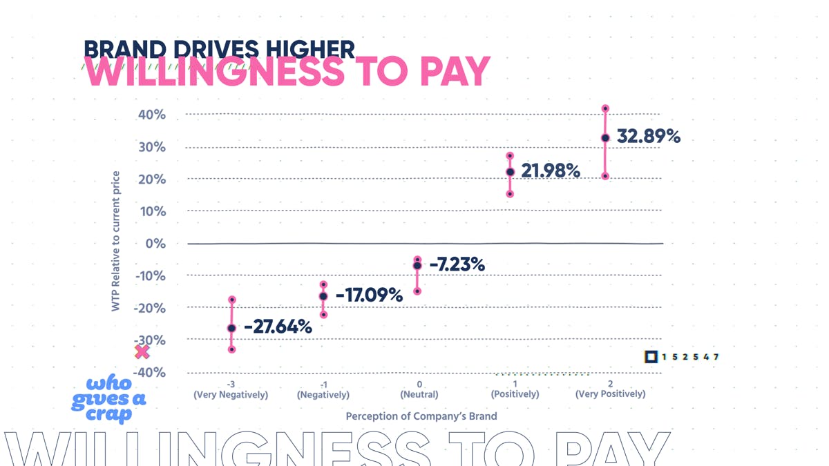 Those who had a positive or very positive perception of a brand were ready to pay about 20-30% more than those who were neutral. For Who Gives A Crap, it's hard to have anything but a positive perception. You're not going to get mad at someone who's trying to save the world.