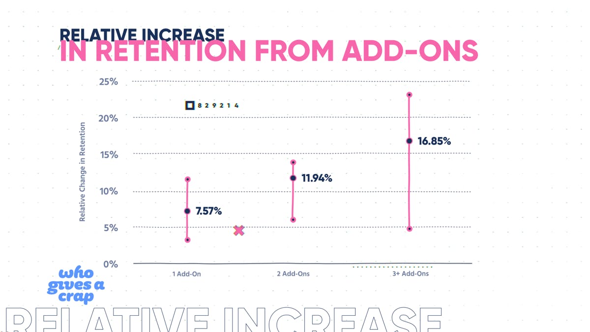 This data is from a bunch of different comp customers and many different products. We measured, "What's the increase in their retention rate based on the number of add-ons that they have in their core plan?" With one add-on, you're looking at about a 7%-10% relative higher retention rate. In the world of DTC, that's a lot. Those folks who have two, three, or more add-ons are measured at about 10%-15% higher retention. That's huge in the long run.