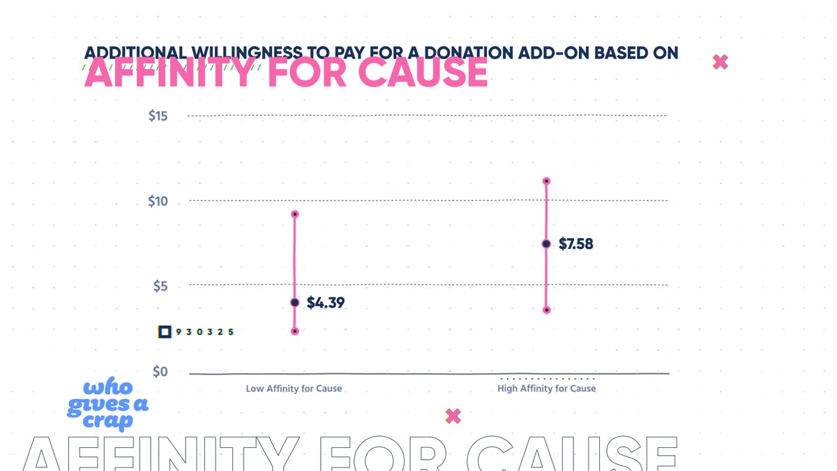 What's fascinating is that those who had a high affinity for the cause were willing to pay about $7-$10 extra per month as a donation. Even those who had a lower affinity were offering about $5. All of a sudden, you're donating a considerably larger amount and helping to build more toilets. We've seen time and time again that folks who pay add-ons in addition to what they're purchasing tend to have much higher retention.