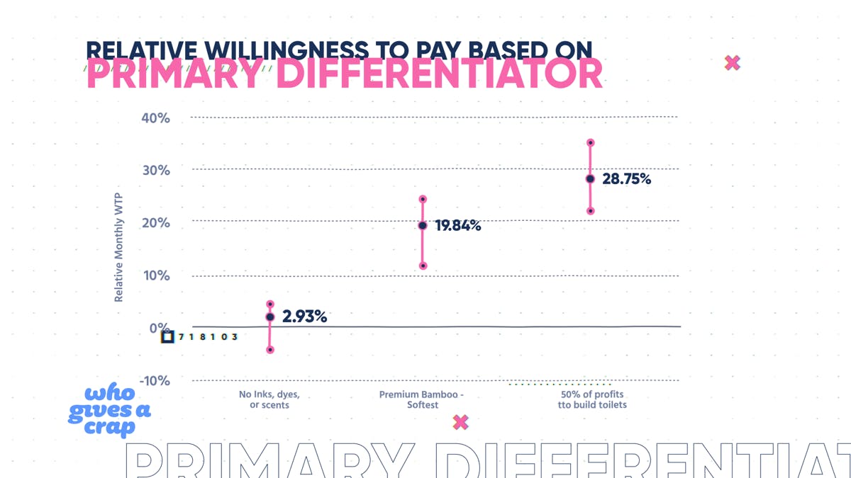 Aligning your brand or product to a social cause can increase your retention and willingness to pay. In Who Gives A Crap’s case, our data showed that willingness to pay jumped about 30% when their cause was added to the positioning. And adding their eco-friendly focus to the positioning also increased willingness to pay by about 20%.