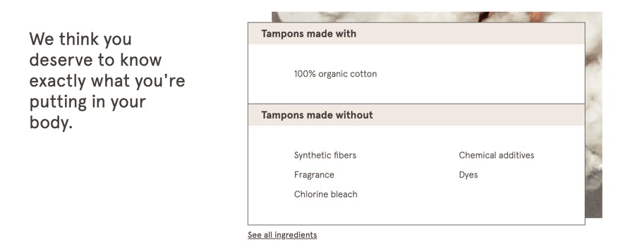 I don't want to belabor the point, but the whole concept of 100% organic, fragrance free, no synthetic fibers, etc., is powerful. What's really powerful is not only in the pricing pages, but that they're continuing to reinforce it right there in the box about where the ingredients are. As a guy, l don't think we appreciate how crappy the materials in a lot of tampons are. LOLA's definitely leaned into it, and I think it’s a huge source of value.