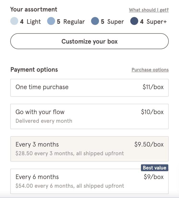 One other thing that LOLA does really well, and they kind of have to, given the nature of the problem that they're solving, is they have customizable packaging to solve the user fragmentation problem. What you'll notice here is that LOLA actually gives you options based on your body, in terms of absorbency, leakage, and these types of things. What's good about it is that then you also have the options of every four or every eight weeks, depending on your cycle. Once you customize this, you basically throw it into the cart and go from there.