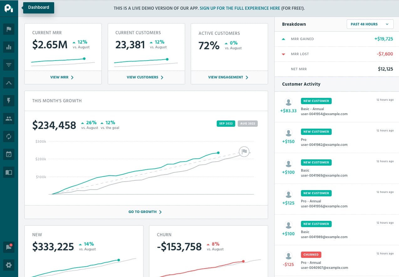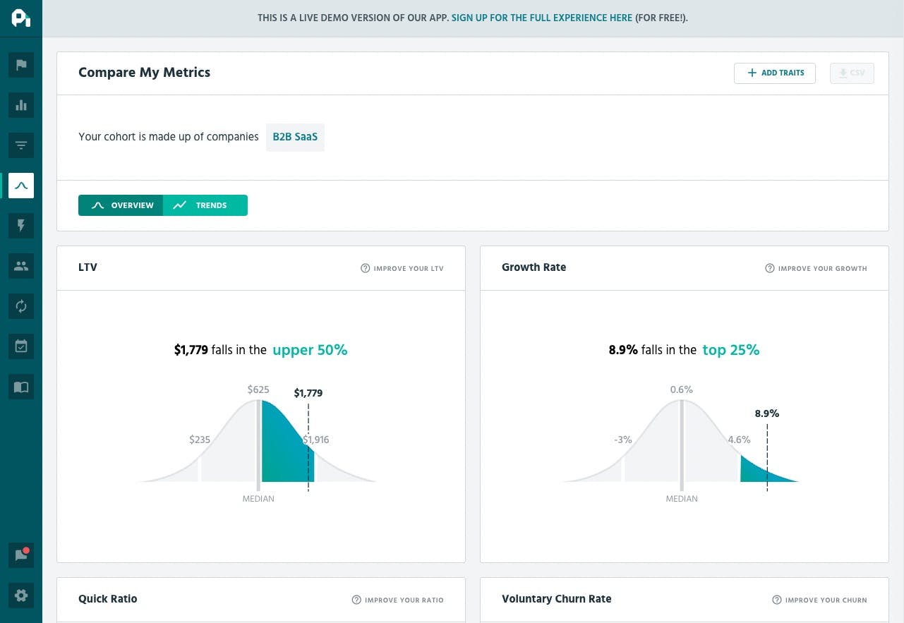 ProfitWell Metrics gives you access to the biggest subscription database in SaaS with powerful benchmarking and segmentation tools. Compare your performance against 30 000 subscription and SaaS companies to see how your growth and unit economics compare. Drill into customer segments, cohorts and pricing plan data to find trends.