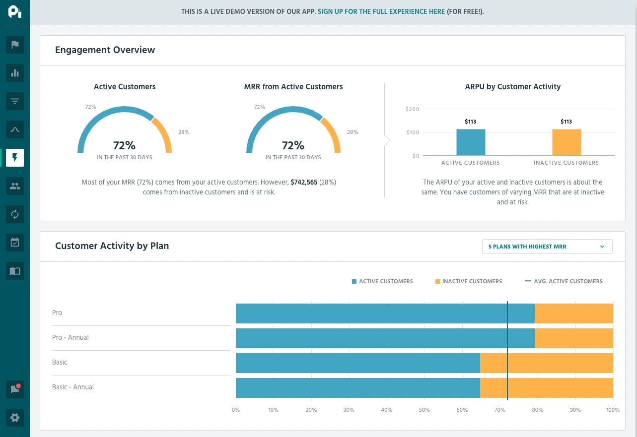 ProfitWell Metrics’ customer health scores and signals show you where and how to grow your customers’ spend. Reports help you monitor user engagement to help you see who’s ready to convert or upgrade. You can also nudge active trialing users or target loyal customers for upsell and cross-sell opportunities.