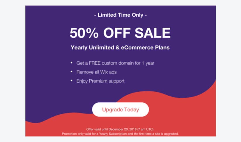 Website builder Wix captures the urgency of new website owners using their freemium plan by offering 50% off an upgrade. The trick? It’s only available for a limited period of time.