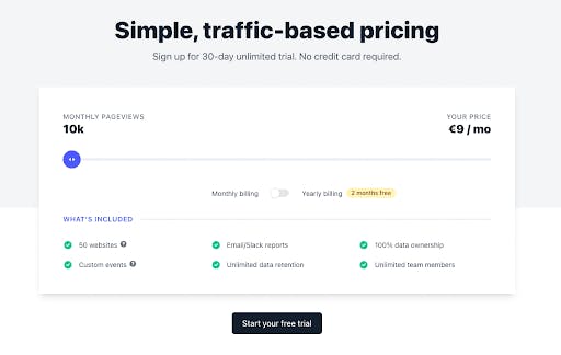 With a broad range of customers, Plausible needed pricing that suits different needs and different business stages. As such, the pricing is based on website traffic (monthly page views).