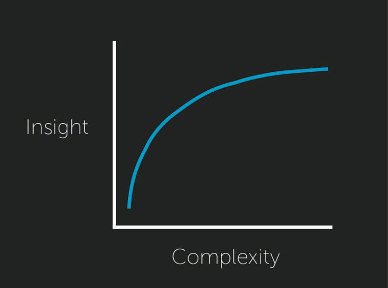 The above graph illustrates the relationship between insight and complexity for modeling. Insight is needed initially. Once a deep understanding exists, complexity can increase and provide even further valuable insight.