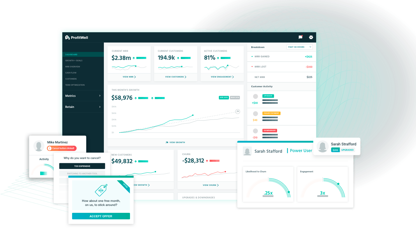 With Paddle + ProfitWell Metrics integration, you get powerful, out-of-the-box features helping you track your subscription growth in real-time.