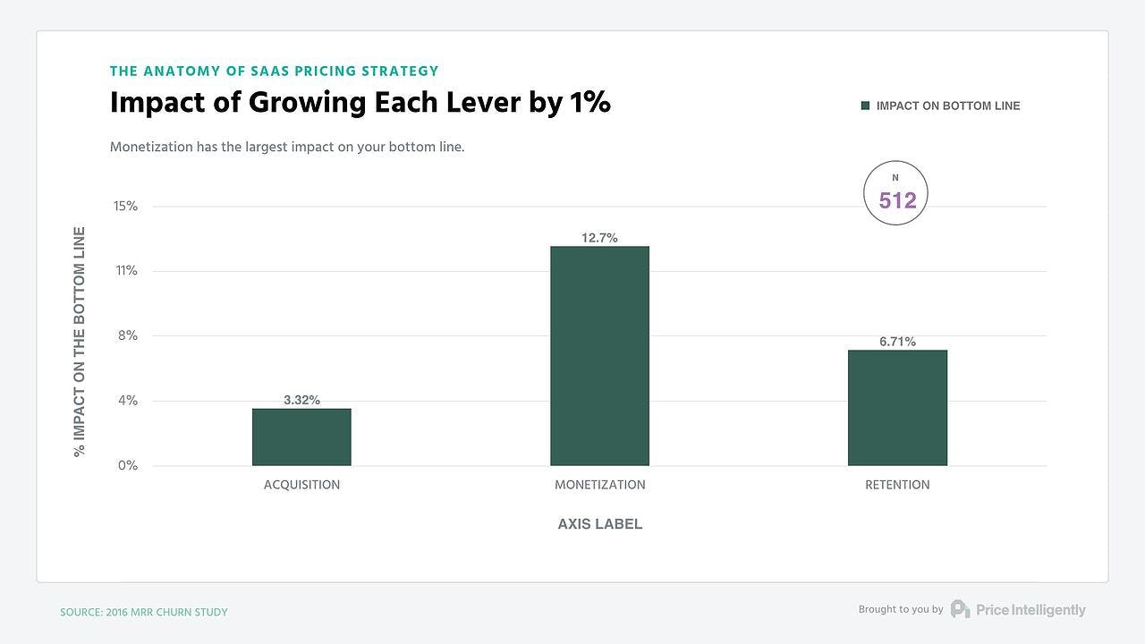 In our study of 512 SaaS companies, we found that software monetization had the largest impact by far on your bottom line. This could mean targeting better customer channels, or raising prices to better fit value.Data shows that pricing is 4x as efficient in improving revenue as acquisition, 2x as efficient as improving retention. By concentrating on pricing, and looking for all possible improvements, you have the chance to use this most effective lever to maximize your profits.