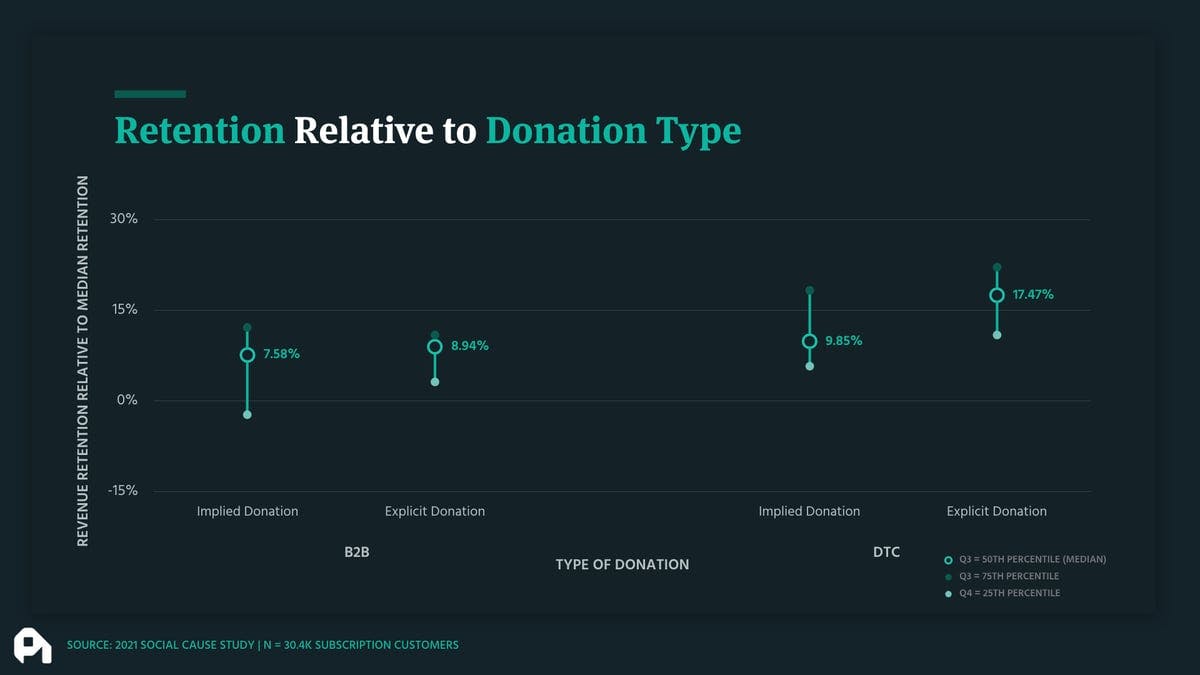 Now, other companies will do this in a little bit of a implicit manner where they'll basically say that like, Hey, by the way, X percent of all revenue or profit is going to go to a particular cause. Now, while these companies may be, you know, trying to do the right thing here and trying to save the world, these practices actually have some pretty stark impacts on subscription retention, as I've already kind of told you, when we looked at revenue retention of companies either doing this implied donation a.k.a X percent of our profits goes to cause a or an explicit donation, meaning, hey, your product is $10, how about adding $1 per month in order to,