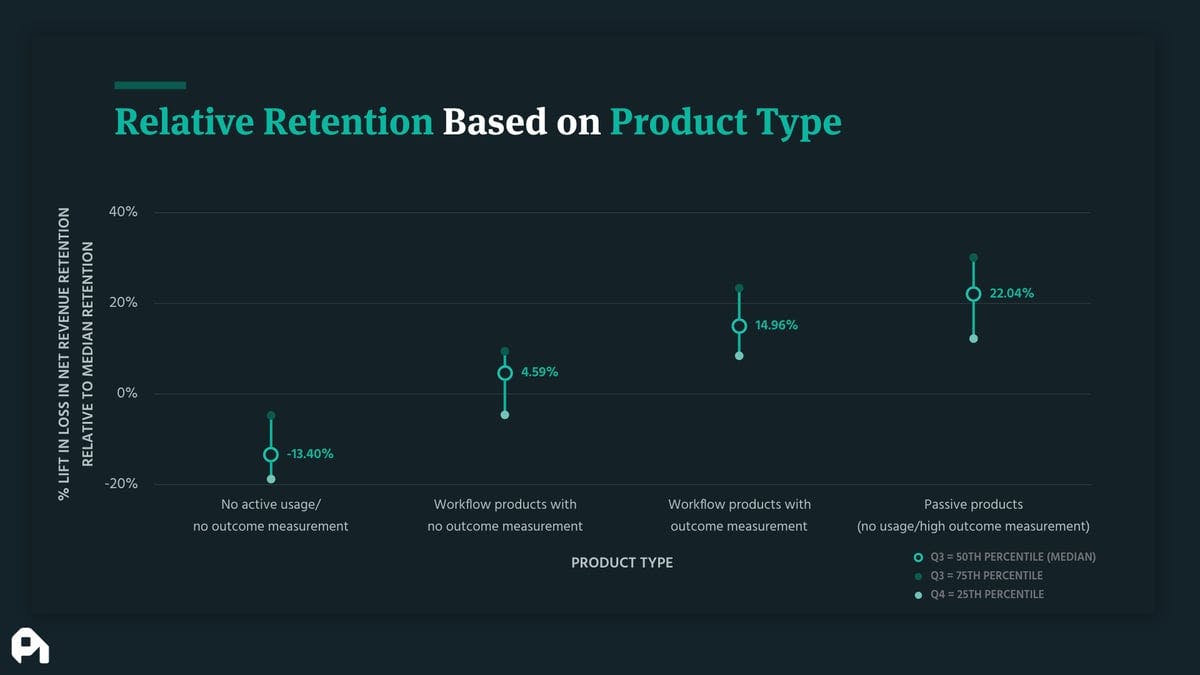 So products with high outcome measurement and no active usage. So the profile over teens of the worlds, the mean streets, the vans tend to have the greatest lift on retention. So the lift is about 25% on a median basis. There's a bit of a range here, so you can kind of check that out. Products that require active usage but have high output measurement, meaning like the HubSpot.