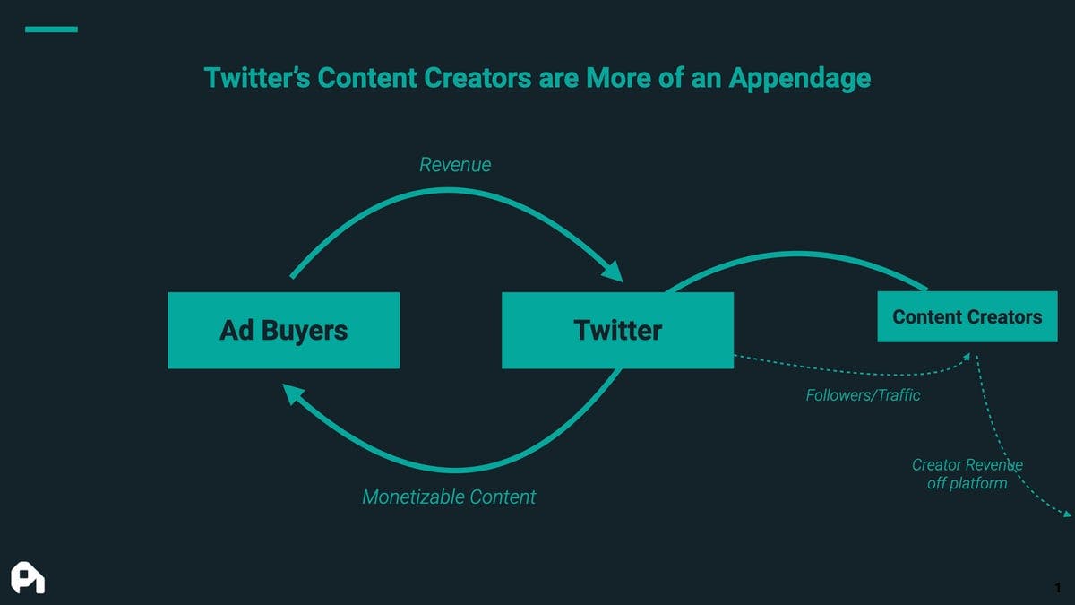 Twitter trapped creators on Twitter and gave them no real way to monetize. Twitter still needed creators though, because they needed content to put ads on. Creators hated all this because their revenue creation kept going down and they couldn't communicate directly with their audience. Everyone's misaligned.