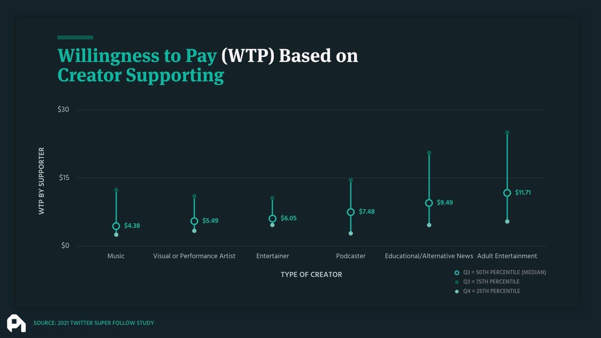 So musicians had the lowest willingness to pay right around about $5 per month, meaning, you know, you subscribing to a musician or a group visual or performance artists was a little bit higher, just over $5. Entertainers were just at about $6, podcasters about 750 per month. And these are all the mediums. Educational or alternative news was about $10 per month.