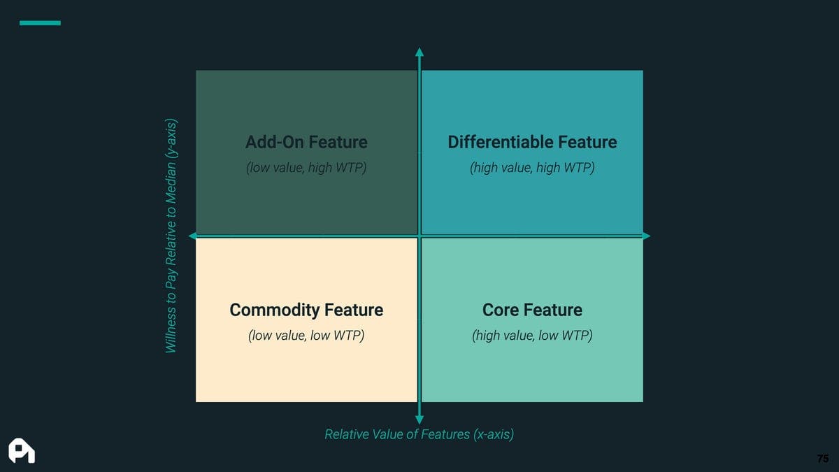 So the horizontal access, and then we cross-reference it with willingness to pay. So that's the y axis of the vertical access. So put another way, if we find a feature that the whole group likes, like it's one of the most important features, but then also the people who really, really like that feature is their number one. They're willing to pay more than that feature ends up in the upper right quadrant, so high x access and high Y access.