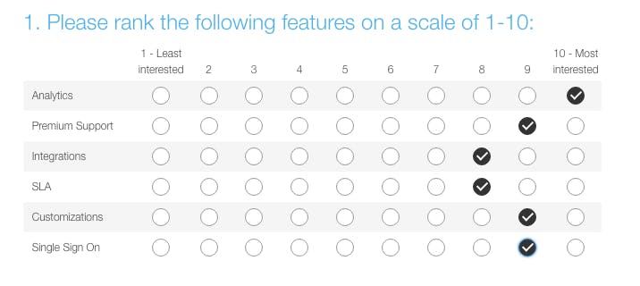 You should never ask people to rank features on a scale. You won’t get any differentiation. Yet, the most commonly used method to determine feature value is to ask people on a 1-10 scale which features they would like to see most in your product: