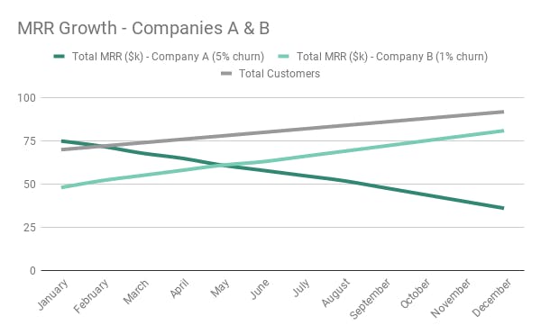 Company A has invested more directly into revenue growth than Company B, and for the sake of argument let's say both companies are getting customers at the same rate. Company A's revenue growth might be high, but its churn is so high that their MRR is going down. Company B started lower, with less month-on-month growth, but because their churn is absolutely under control, it doesn't take long for them to overtake Company A.