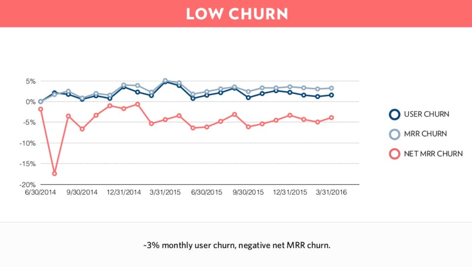 This across-the-board MRR expansion was greater than the MRR we were losing from our 3% monthly user churn. We had achieved net negative churn—our MRR from our existing customer base was expanding over time in spite of churn. From an investor's perspective, by achieving growth independent of acquisition, we had tapped into a reliable and scalable growth machine.