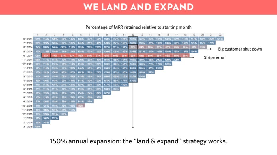 By cross-selling and up-selling customers, we pushed the MRR retained for each cohort of acquired customers (grouped by sign-up date) to greater than 100% net of churn.