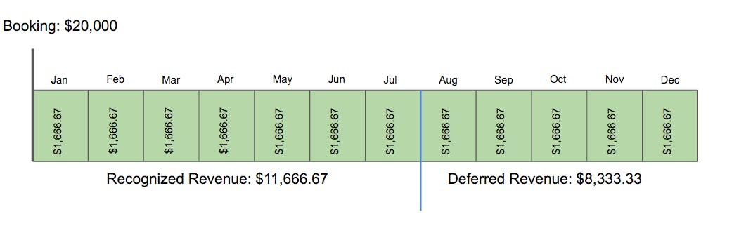 Deferred revenue is the inverse of recognized revenue. It’s the amount of bookings that has yet to be recognized. i.e. you haven’t delivered your service in return for that money yet. As recognized revenue goes up, deferred revenue goes down. In the above example, on August 1, $11,666.67 of the $20,000 booking has been recognized, and the remaining $8,333.33 is deferred.
