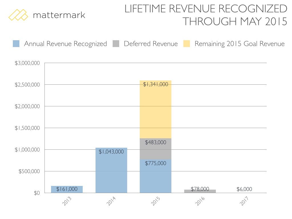 Up until May 2015, Mattermark had recognized $775,000 worth of its revenue, but still had $483,000 of revenue to recognize within the year for services it had yet to deliver, along with $84,000 of revenue that it has already booked for 2016/17. That $775,000 will slowly increase and $483,000 will slowly decrease throughout the year as they deliver their services to their customers and earn that deferred revenue.
