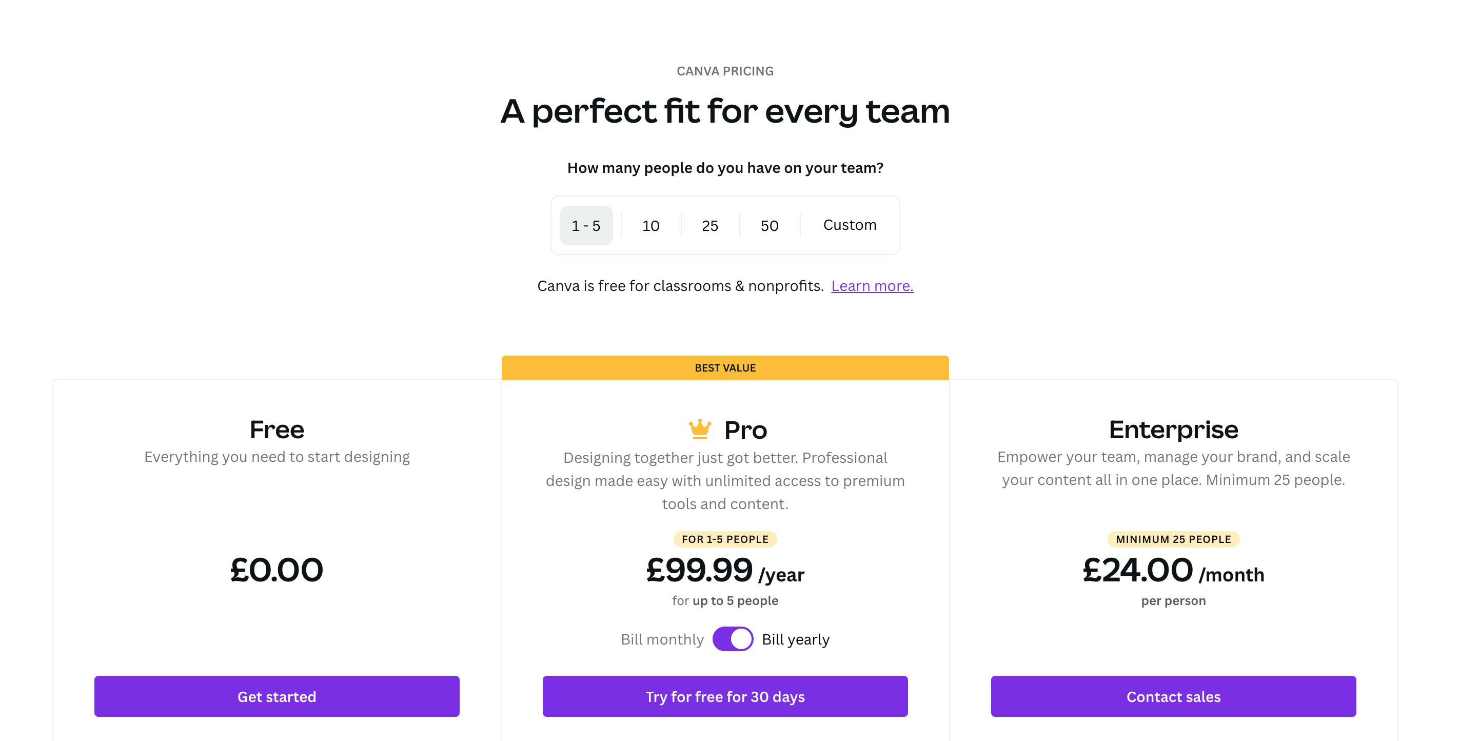 The online graphic design tool Canva offers a per-user option among its other pricing options. For $30 per user per month, this includes all features from the Pro model, with access for every user on a team.