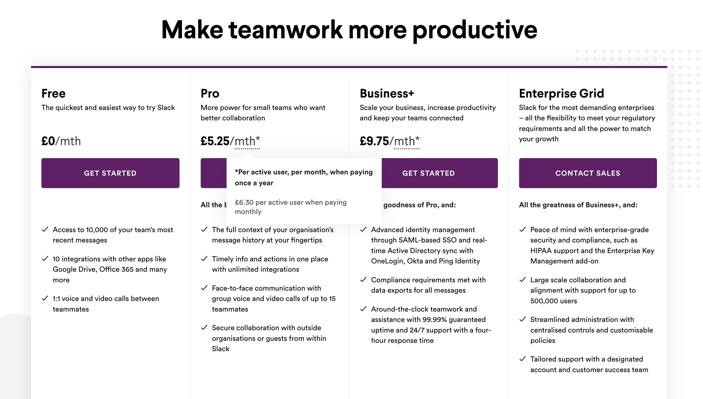 Now, Slack combines two different pricing models, charging per seat but also giving customers multiple tiers to choose from. New buyers have a choice of three tiers, and each tier unlocks additional functionality: