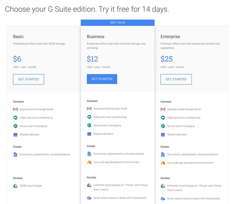Like Slack, Google's G Suite product intentionally keeps its pricing straightforward and easy to digest.