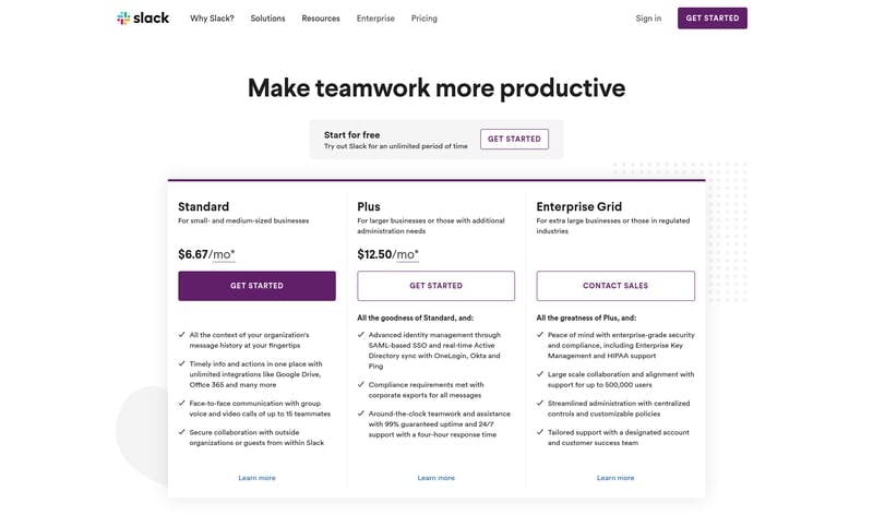 - The Standard plan lifts the restrictions on message history and integrations but excludes enterprise services like single sign-on.