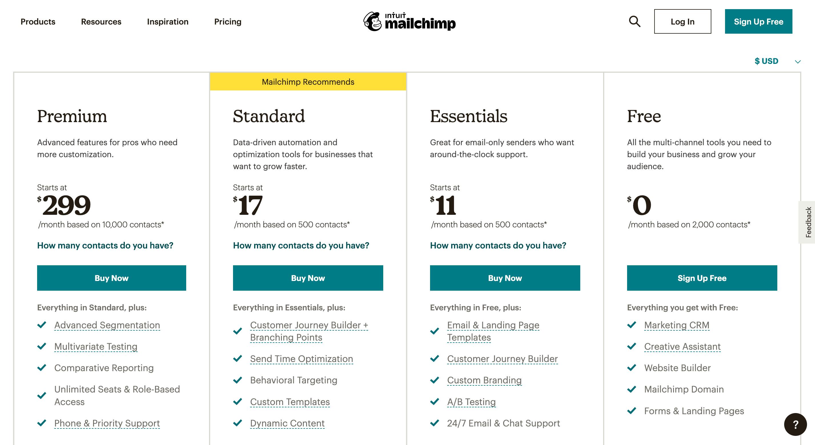 MailChimp is a popular email marketing platform with a generous freemium offering. Users can get started easily, with enough free functionality to get them up and running. Once their email list grows beyond 2000 subscribers, they can upgrade to the first paid tier to access more features.