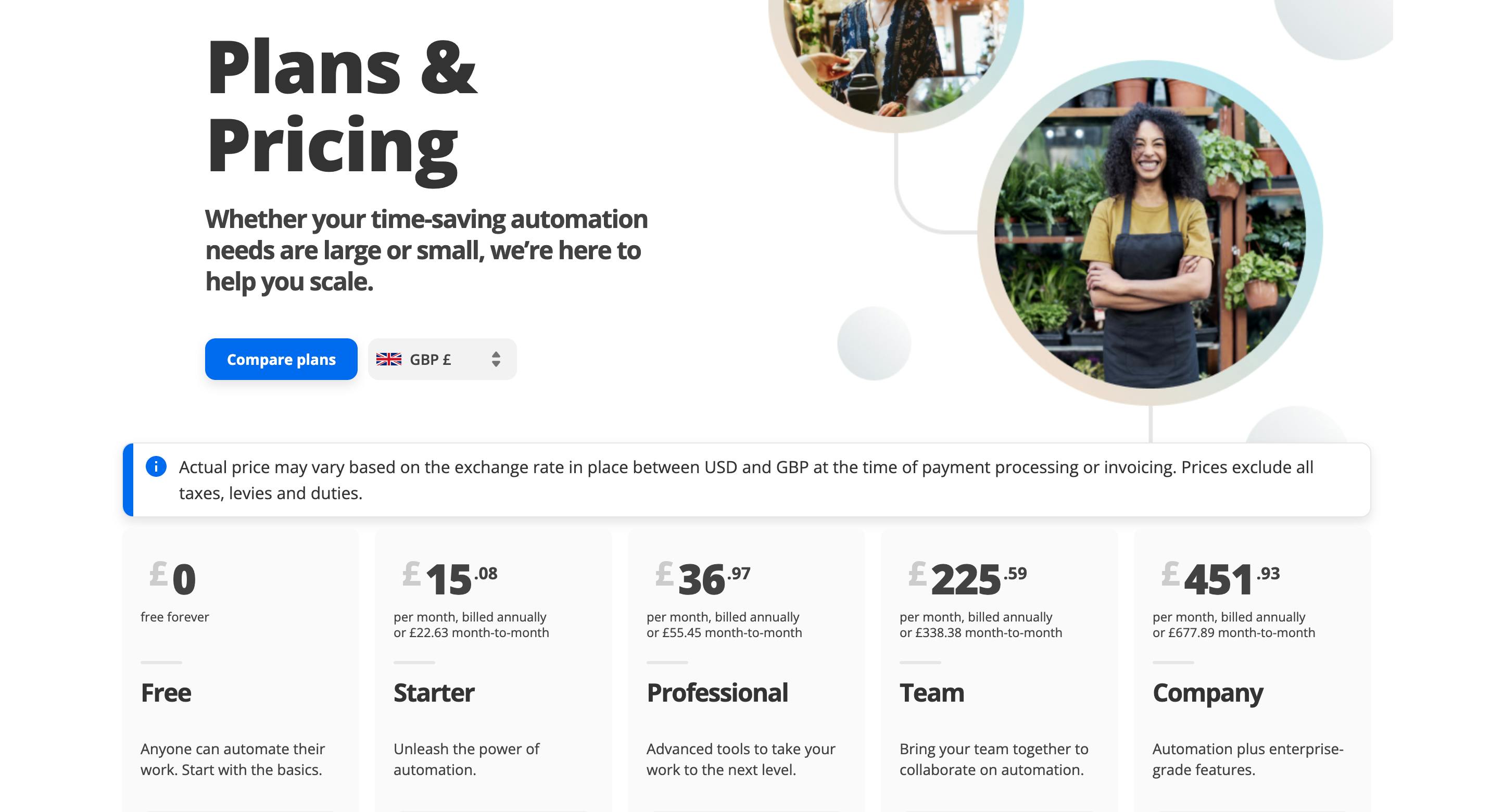 Zapier is a tool that helps users automate commonly repeated tasks. They use a pricing model structured around five tiers, ranging from ‘Free’ (zero cost) at the bottom to ‘Company’ (599 USD per month) at the top.
