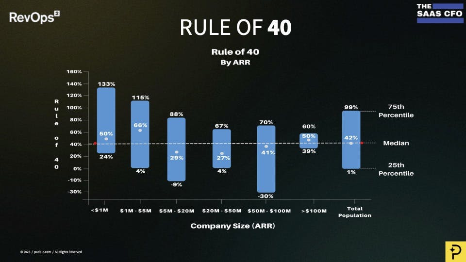 Benchmark: In the first half of 2022, the Rule of 40 median was 42%. However, with efficient growth cool again, the benchmark has increased by 3x from January 2022 to January 2023 (i.e. highly negative numbers at an early stage are now a red flag and some private equity companies are looking at rule of 50 and rule of 60 for the top 10% of companies).