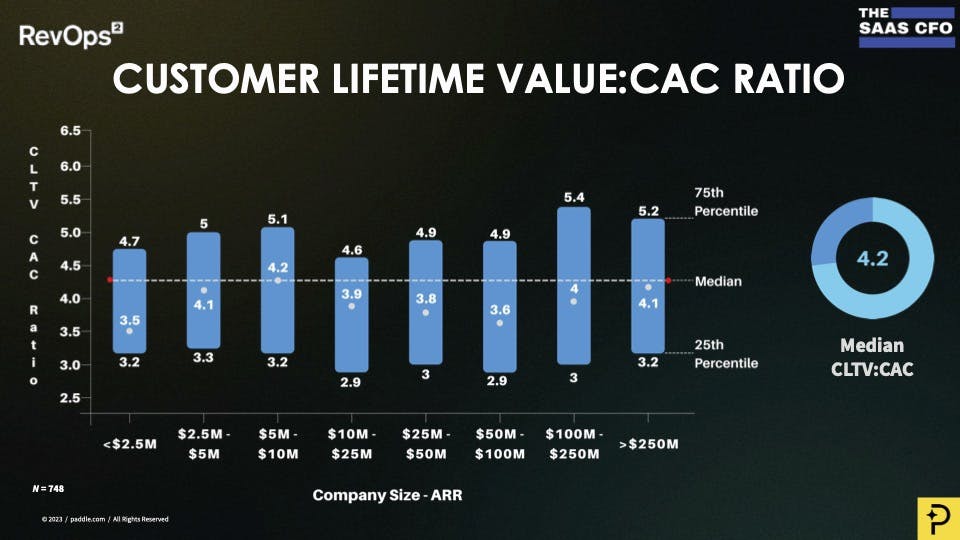 Benchmark: The median CLTV:CAC for companies over $5 million in 2022 was around $4.2, so the new rule of thumb is 4:1 (not 3:1 as in previous years).