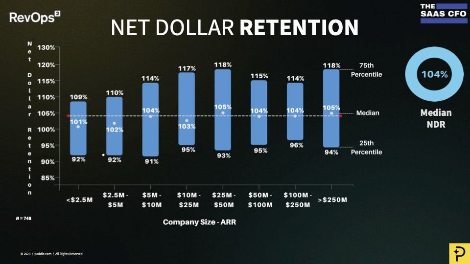Benchmark: >120% NDR is best in class net revenue retention with median NDR around 105% in 2022.